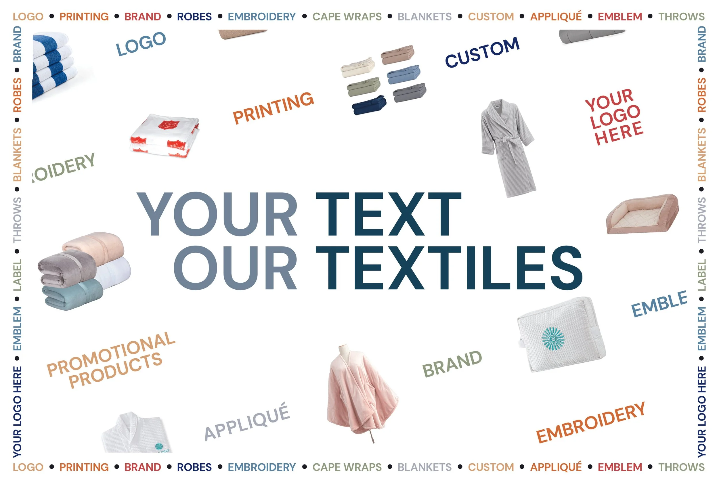 From apparel products and towels to blankets and throws- we offer unique customized products that’ll boost your brand visibility - your text, our textiles!